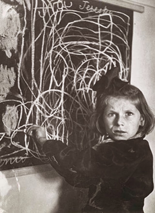 11. Terezka creció en un campo de concentración y después de la guerra vivió en un internado para niños con retrasos en el desarrollo. En la foto dibujando su casa.